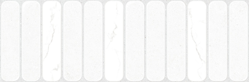 Коллекция настенной плитки Amarant в формате 300x900 мм представляет собой сочетание текстур: песчаной камешковой штукатурки, белого мрамора и геометричных узоров. Цветовая палитра коллекции выполнена в бело-серых оттенках. Акцентными элементами серии являются три вида декоративного массива: «ёлочка», «геометричные ромбы» и оригинальные овальные плашки с эффектом 3D. Все элементы произведены с матовой поверхностью, а также имеют ректифицированный край. Дополняют коллекцию платиновый бордюр, ректифицированный керамогранит с текстурой белого мрамора или бетона в формате 600x600 мм или керамогранит с деревянной текстурой в формате 200x900 мм. Вариативность элементов коллекции позволяет создать разный дизайн в помещениях, но в единой концепции. Таким образом получается готовое решение для всей квартиры или дома в рамках одной коллекции.