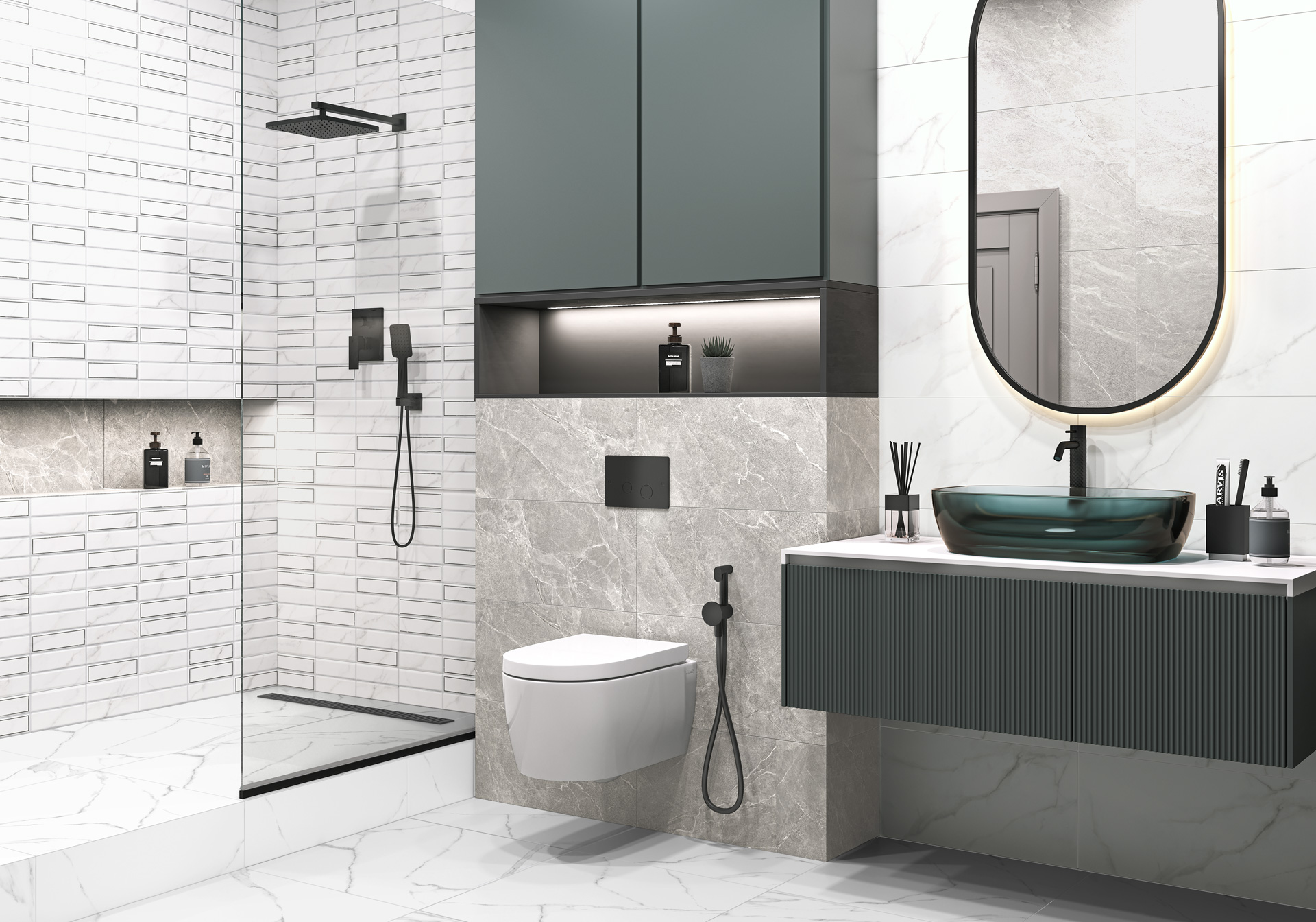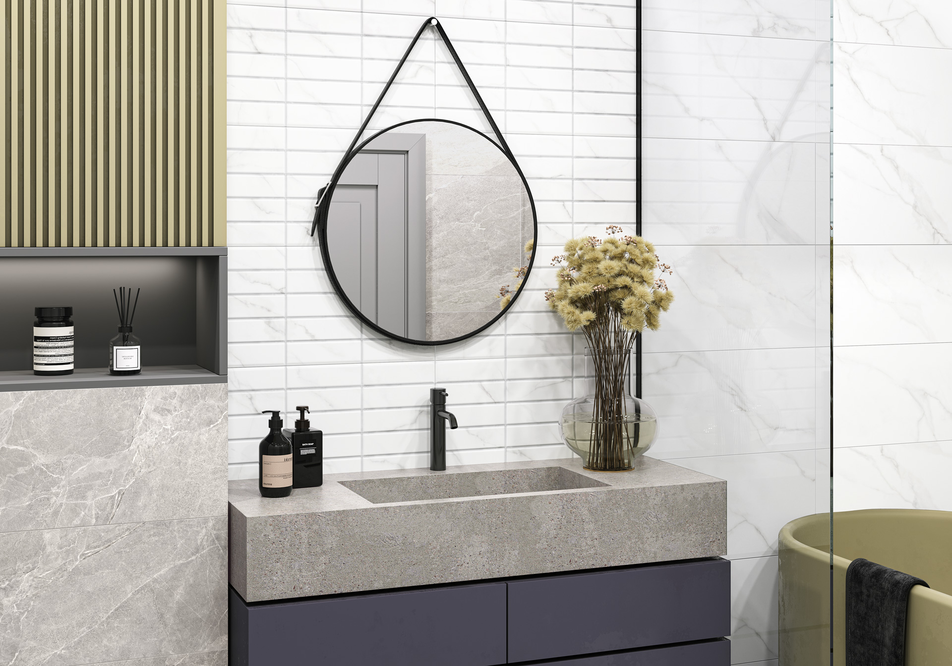 Коллекция Bronks привносит в пространство ванной комнаты холодное величие и живую историю натурального мрамора. Стены здесь — полотно благородных текстур. Белый мрамор, пронизанный элегантными серыми прожилками, гармонично продолжает серый мрамор благородного оттенка. Вместе они создают уютную атмосферу и современное оформление. Декоративный массив на рельефе будто возвращает нас к истокам ремесла, добавляя стенам лёгкую динамику и визуальную игру света, а тонкий серебристый бордюр является изящным дополнением интерьера. Коллекция дополнена крупноформатным керамогранитом 600x600 мм с текстурой белого мрамора в тон настенной плитки и контрастным акцентом в виде доски тёплого оттенка в формате 200x900 мм. Коллекция Bronks — это возможность создать любимый интерьер, где роскошь мрамора встречается с продуманным дизайном.