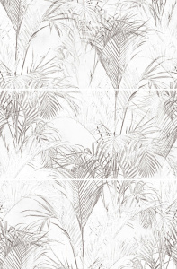 Коллекция Konor в бело-серых цветах — неожиданный, но стильный фьюжн бетона и флористики. Реалистичная цементная текстура уравновешивается изящным акварельным рисунком пальмовых ветвей на панно, дополненным серебряными линиями глиттера и листьями с зеркальным эффектом. Платиновый бордюр-стик подчеркнет тональность коллекции и будет хорошо сочетаться с хромированными аксессуарами.